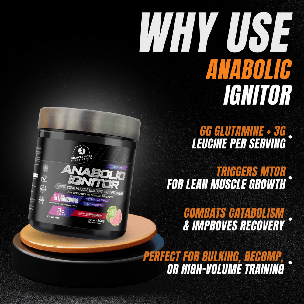 MuscleOoze Anabolic Ignitor is a premium post-workout formula combining 6g L-Glutamine and 3g L-Leucine per serving to fuel lean muscle growth, rapid recovery, and reduce soreness. A must-have for athletes serious about building mass without compromising recovery.