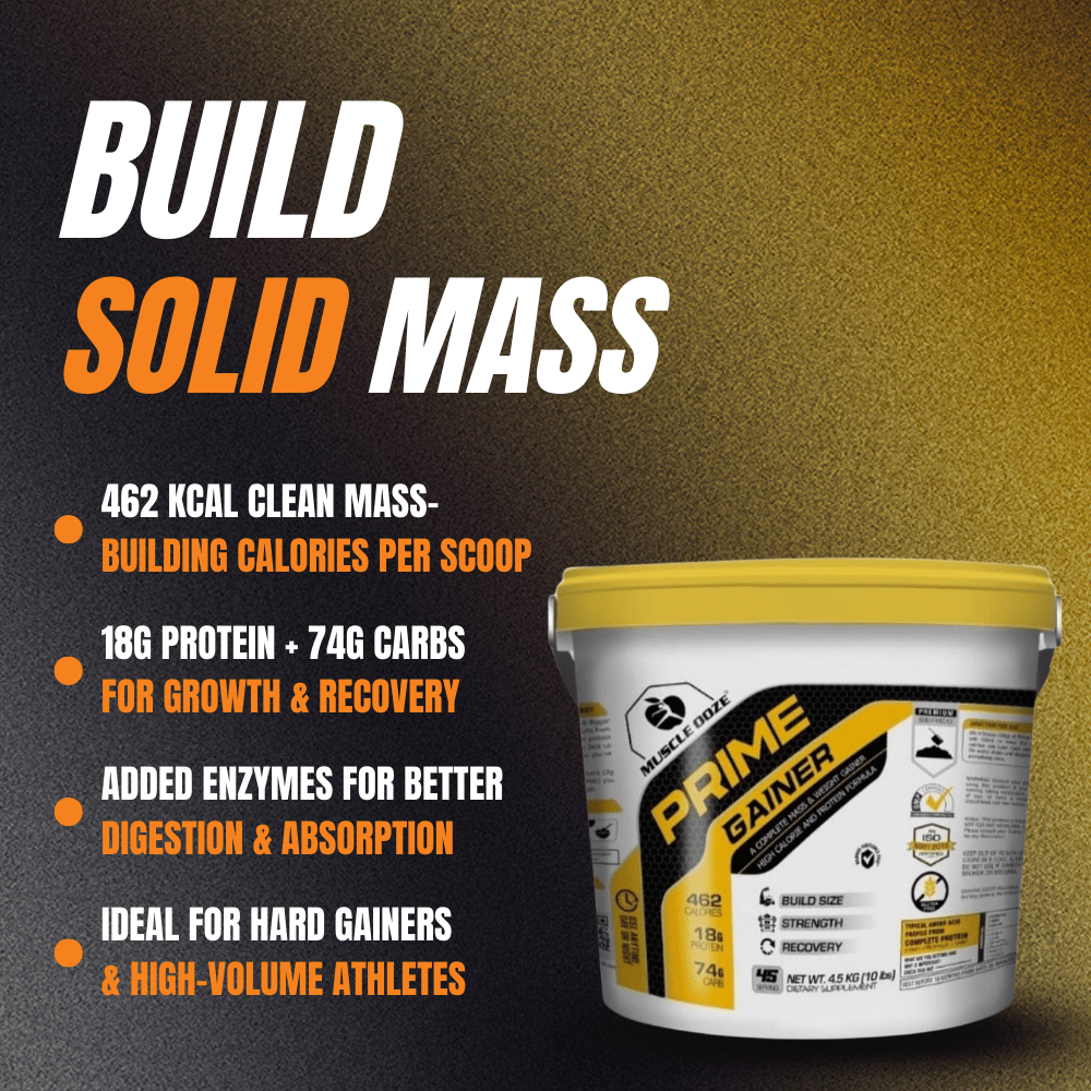 MuscleOoze® Prime Gainer is a scientifically crafted mass and weight gaining formula designed for hard-gainers and athletes who want real, clean bulk — without the fluff.