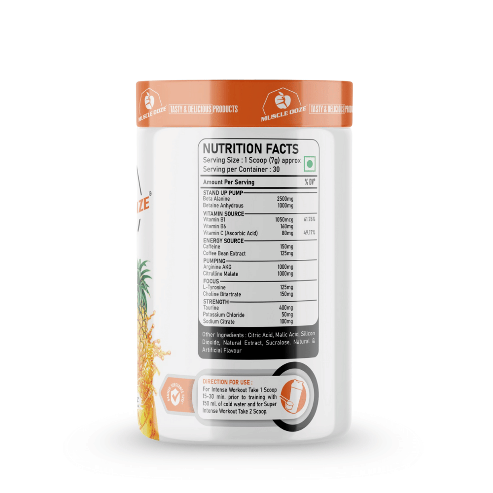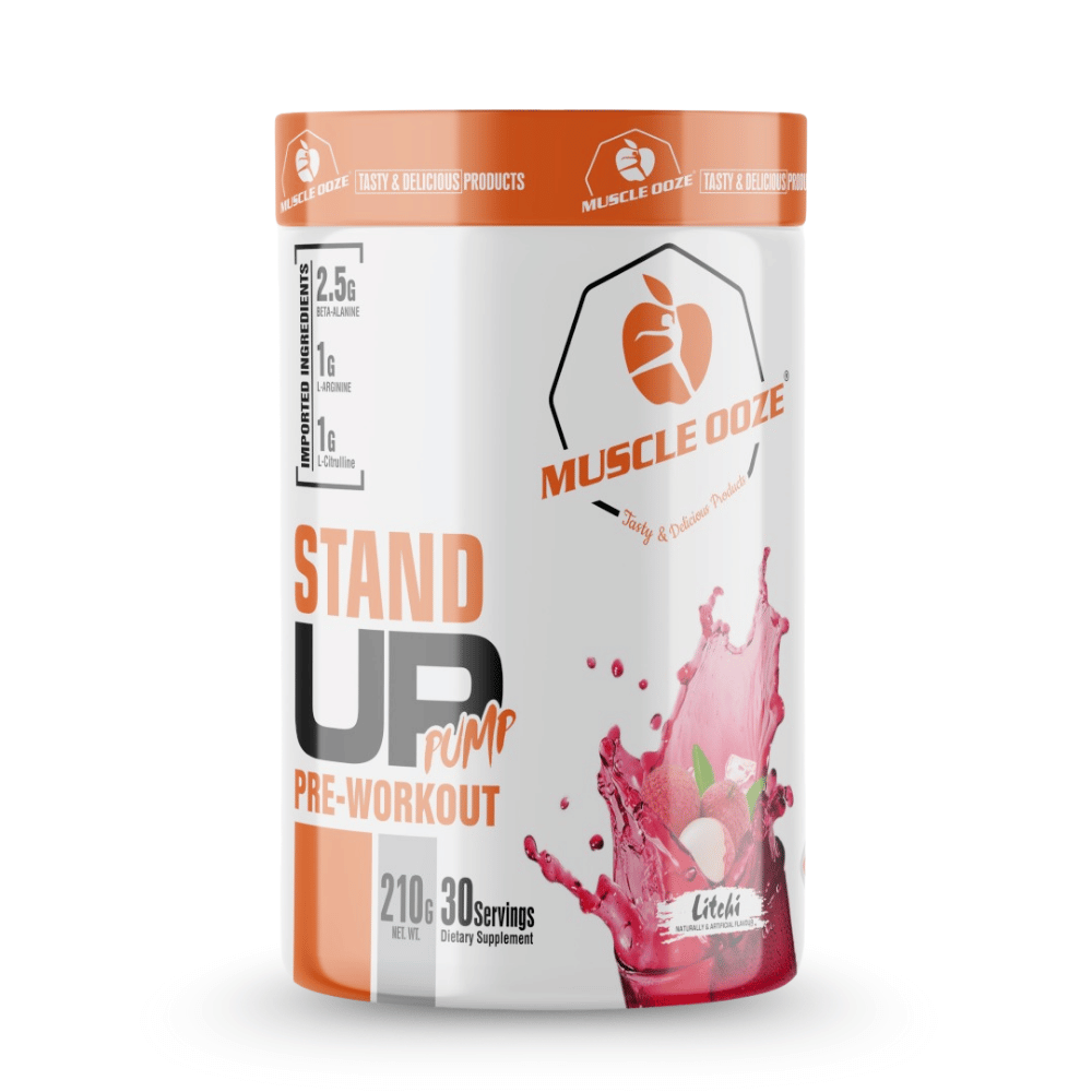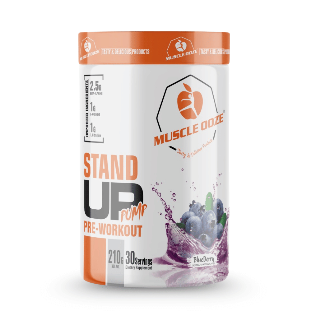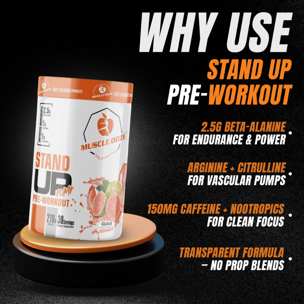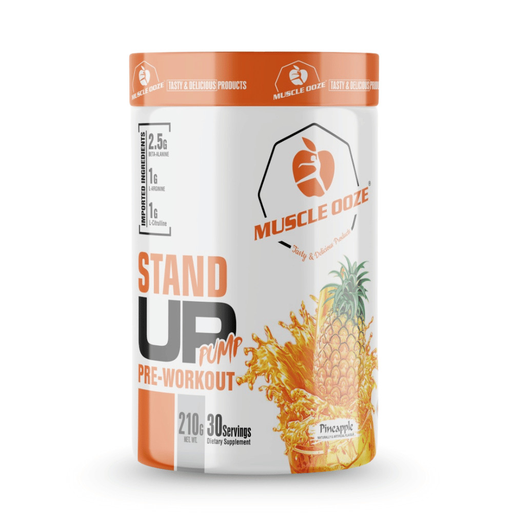 Unleash intense pumps, razor-sharp focus, and clean energy with MuscleOoze® Stand Up PUMP Pre-Workout — formulated with 2.5g Beta-Alanine, 1g Arginine, 1g Citrulline Malate, and 150mg caffeine per scoop in a bold Pineapple blast.